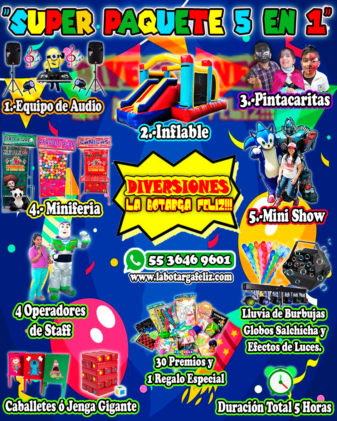 Hoy, nos dedicamos a hacer más fácil para las familias el celebrar momentos especiales con sus peques. Ofrecemos paquetes completos que incluyen shows con botargas, animación infantil, música, juegos y muchas sorpresas más, todo a un precio accesible y con muchas atracciones incluidas. Nos esforzamos cada día por ampliar nuestro catálogo de personajes y brindar un servicio de calidad que deje huella.